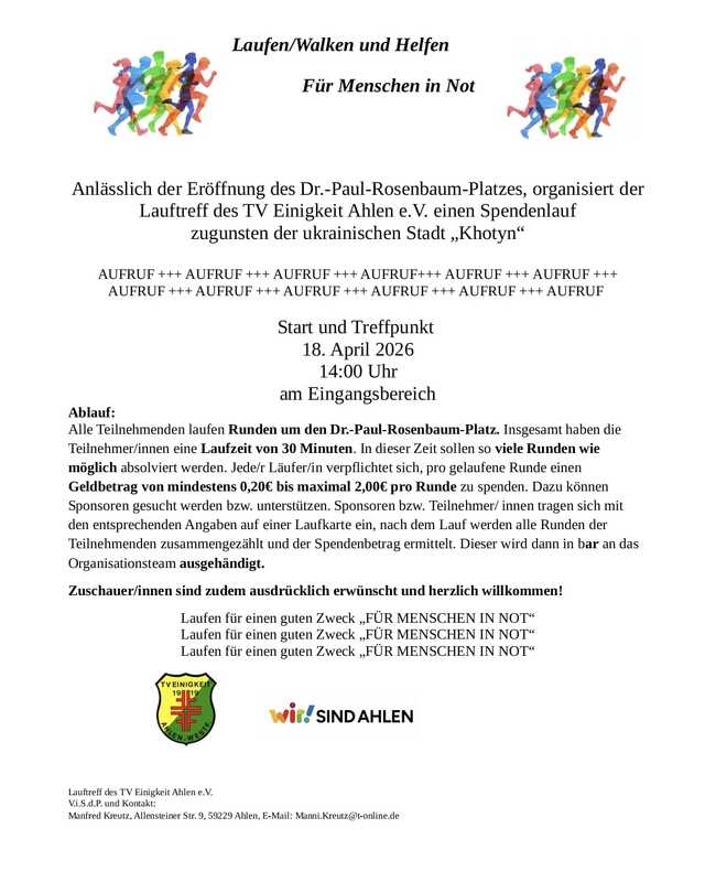 Anlässlich der Eröffnung des Dr.-Paul-Rosenbaum-Platzes organisiert der Lauftreff des TV Einigkeit Ahlen e.V. einen Spendenlauf zugunsten der ukrainischen Stadt "Khotyn". Für weitere Details: siehe Foto der News.